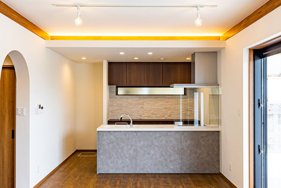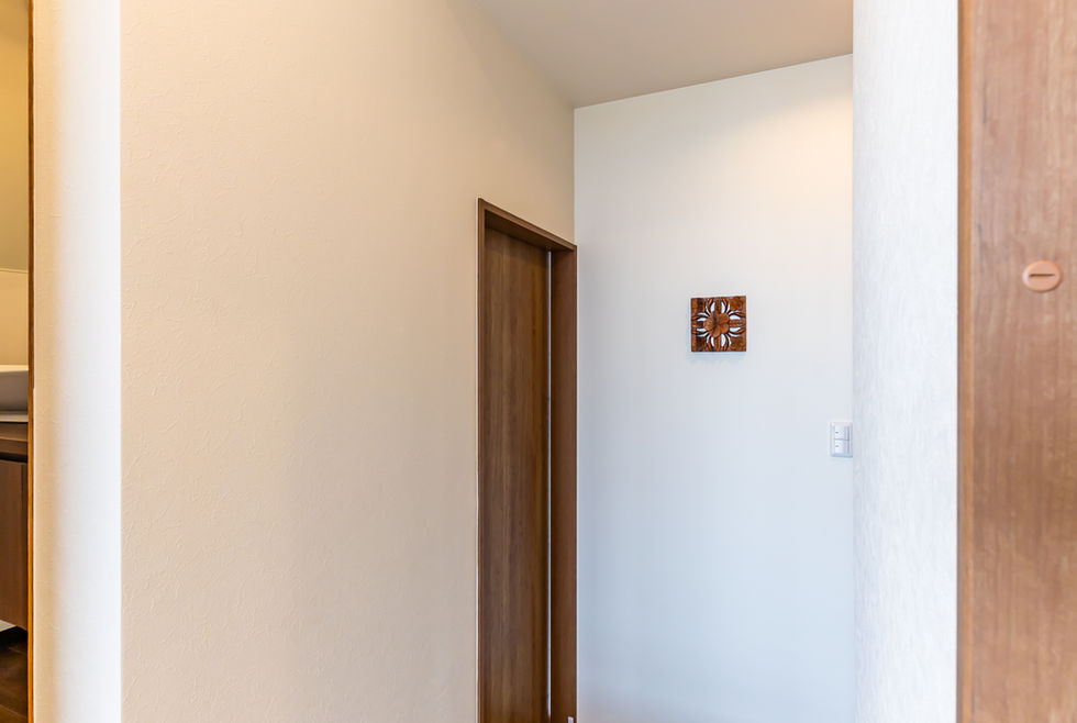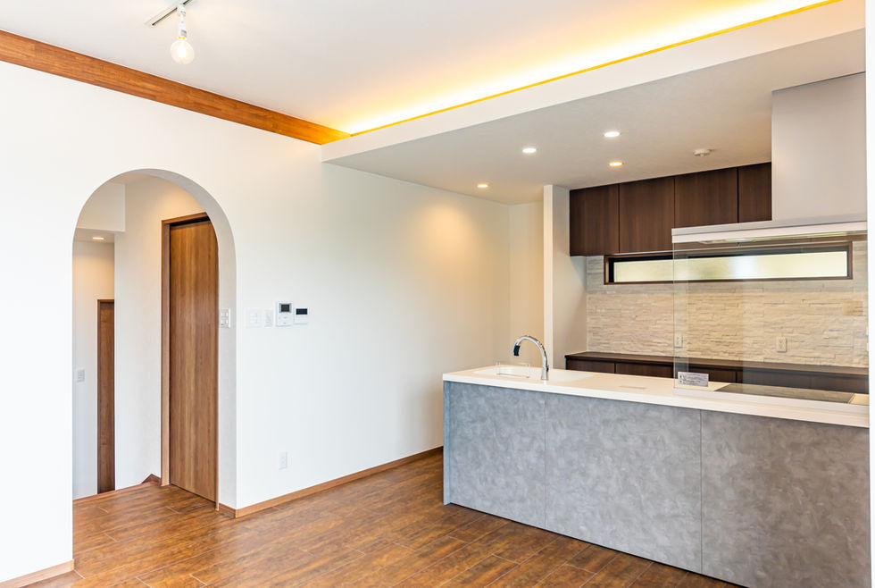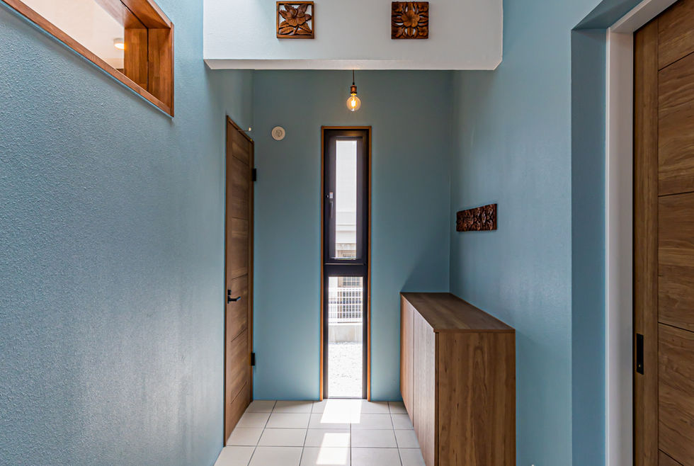 共有の玄関スペースを介して2つの世帯が緩やかに繋がる間取り。敷地形状を活かしたスキップフロアやリビングと繋がるテラス(アウトリビング)など+αの空間をご提案。家主こだわりの照明やインテリア小物に合わせたリゾートスタイル空間をコーディネートしました。